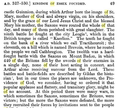 I have many times pointed out that the legendary Arthur's floruit dovetails very nicely with that of Cerdic of Wessex. Henry noticed the same thing, and so when he discusses Arthur in HISTORIA ANGLORUM, he places his paraphrase of Nennius's Arthur chapter between Cerdic's A.D. 527 Charford battle and the latter's conquest of the Isle of Wight in 530.